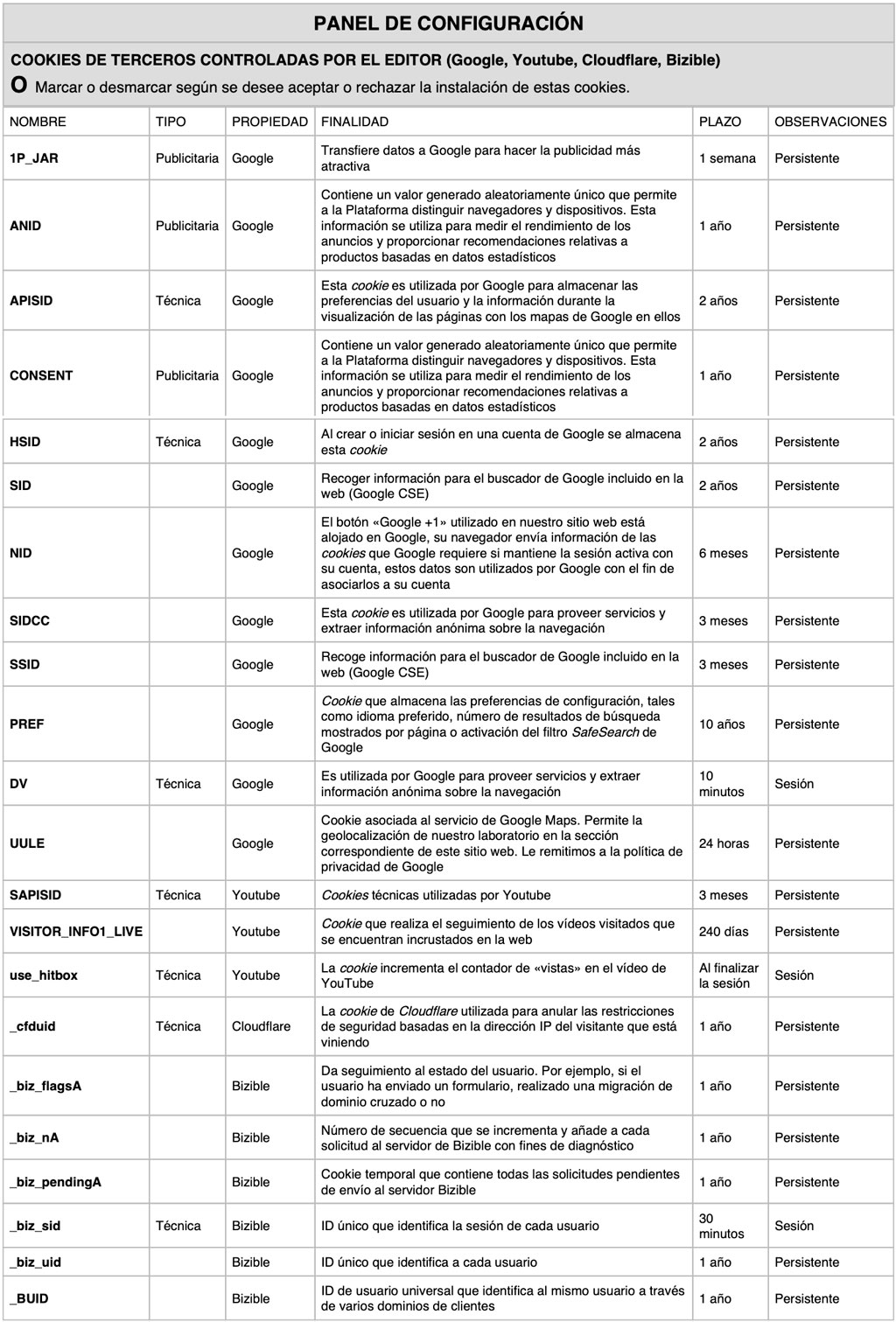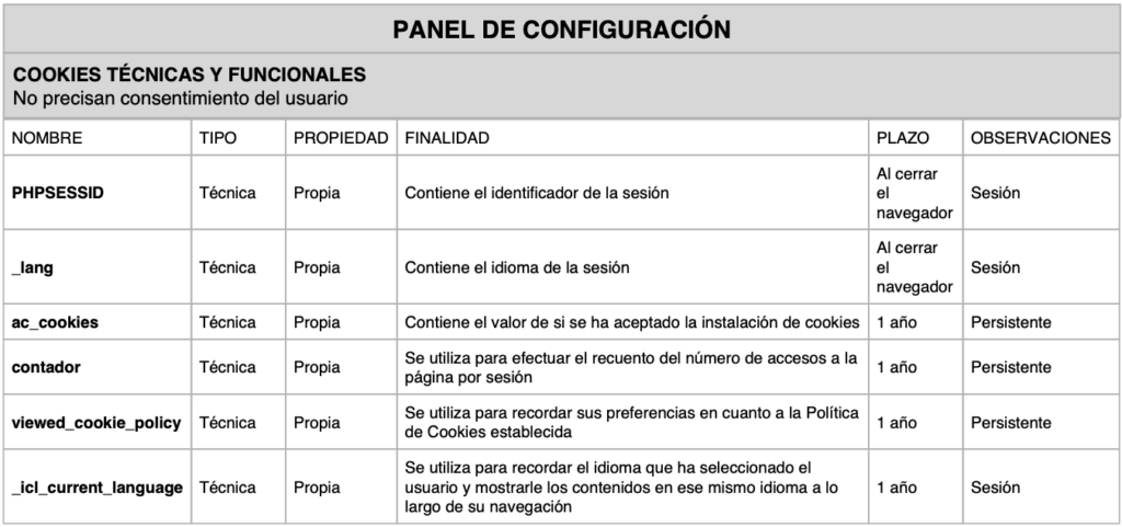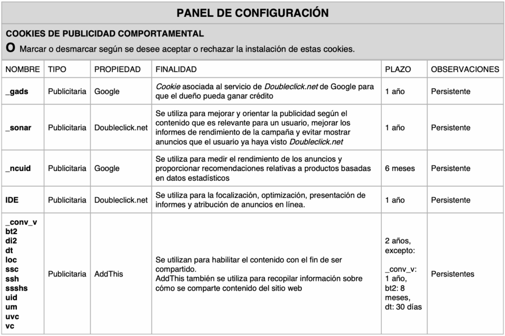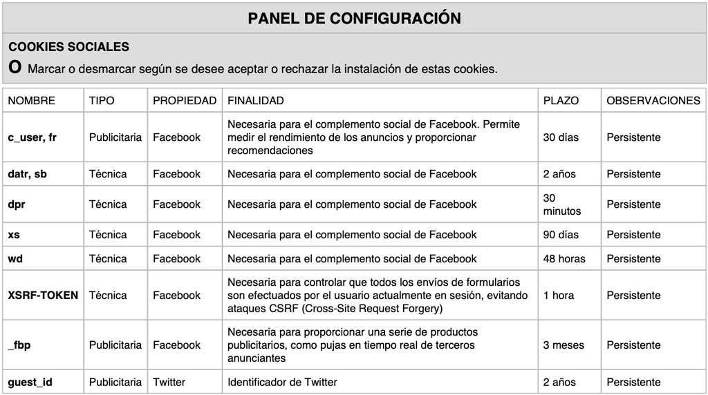 Conforme con la Ley 34/2002, de 11 de julio, de servicios de la sociedad de la información y de comercio electrónico (LSSI), en relación con el Reglamento (UE) 2016/679 del Parlamento Europeo y del Consejo, de 27 de abril de 2016, General de Protección de Datos (RGPD) y la Ley Orgánica 3/2018, de 5 de diciembre, de Protección de Datos y Garantía de los Derechos Digitales (LOPDGDD), es obligado obtener el consentimiento expreso del usuario de todas las páginas web que usan cookies prescindibles, antes de que este navegue por ellas.