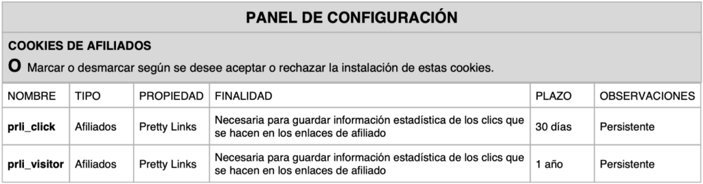 • Cookies de afiliados: permiten hacer un seguimiento de las visitas procedentes de otras webs, con las que el sitio web establece un contrato de afiliación (empresas de afiliación).
