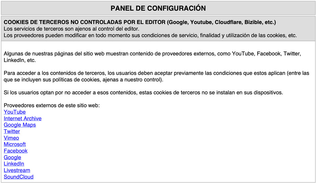 • Cookies de terceros: son aquellas que se envían al equipo terminal del usuario desde un equipo o dominio que no es gestionado por el editor, sino por otra entidad que trata los datos obtenidos través de las cookies.