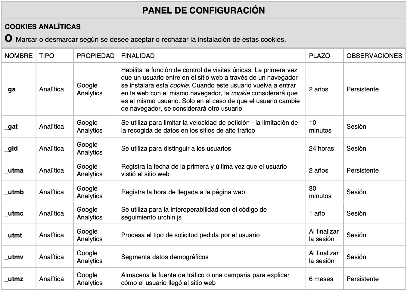 COOKIES UTILIZADAS EN ESTE SITIO WEB